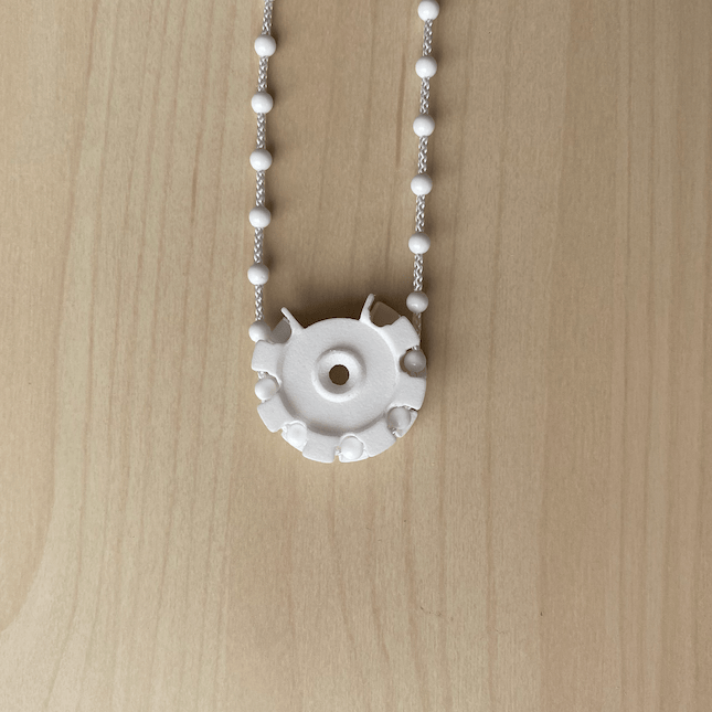 The gearwheel in the picture is compatible with two types of chains: 1) one has 4-5 beads per in./2.5 cm; 2) the second has an extra spacing between the beads, with the third bead positioned at 1 in./2.5 cm from the start. Both chain types have beads that are 3/16 in./4.5 mm wide. The gearwheel has a gap in the teeth for letting the compatible connector link to pass through.
